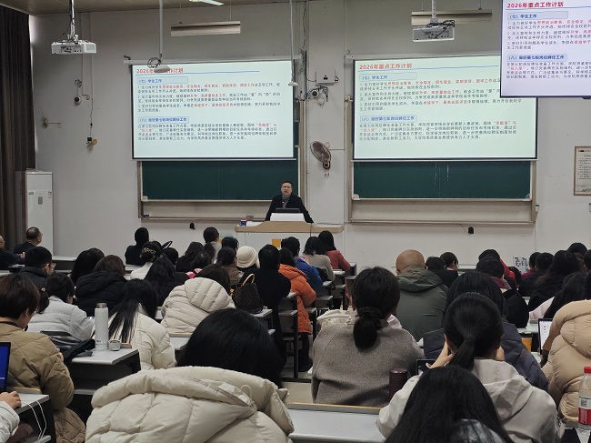 樊燕龙院长通报了学院学期末和寒假期间开展的各项工作情况,特别是绩效分配情况,他从师资建设、学位点建设、学科科研教学工作及文化品牌等方面介绍了学院新学期工作计划,重点介绍了学院2026年需要完成的突破性指标、战略性指标以及学校即将开展的第七轮岗位聘任工作。