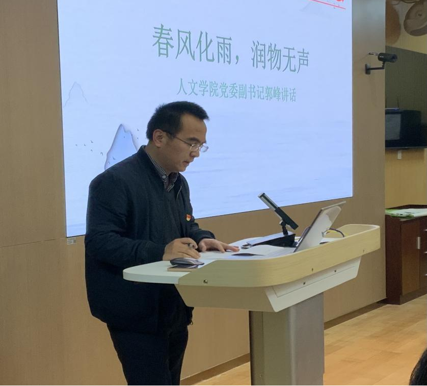 首先,党委副书记郭峰进行发言,郭书记秉承校训和院训,提出育才的殷切期望,并针对培育和造就一支素质全面、勇担重任、模范表率的干部队伍,提出以下几点要求:认真上课,滋养学识,学真本领;学以致用,涵养心灵,提升思想;做好表表率勇担重任,服务学校。