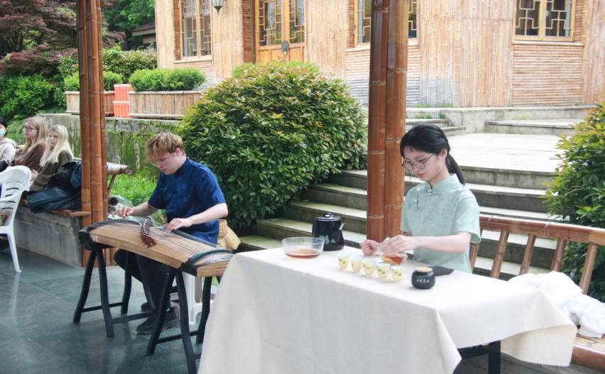在茶文化体验活动的最后,身着中华传统服饰的留学生与七碗茶社合作完成了一场别开生面的“中外融合”茶艺表演。留学生吕泽洋身着深蓝色曲裾袍,手下悠扬的旋律与茶社高盈盈同学“行茶十式”中的茶香相互交织,为现场同学带来了一场视听盛宴。这正说明了,在全球化的今天,中国传统茶文化正以独特的魅力走向世界舞台。中国茶文化海纳百川,喝好茶、交茶友、学茶道……此次活动的成功举办,不仅展示了留学生们对传统文化的热爱和传承,也体现了他们在跨文化交际中的积极作用。他们用自己的实际行动,为促进不同文化之间的理解与尊重,搭建起了一座沟通的桥梁。他们不仅是文化传播者,亦是文化的传承者。