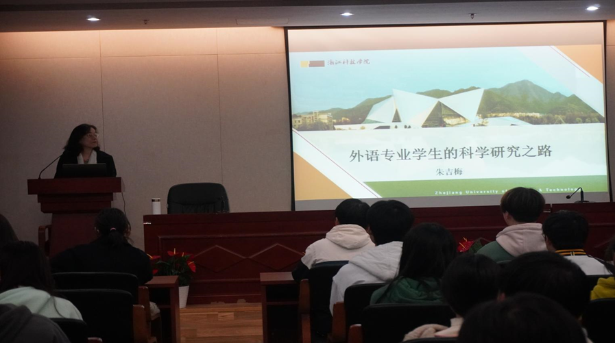 为加强外国语学院同学的科研意识,学院特邀我校图书馆馆长朱吉梅教授于11月15日晚,在安吉校区图书馆四楼报告厅为我院大一大二同学做申报科研项目的讲座。讲座题为“外语专业学生的科学研究之路”。