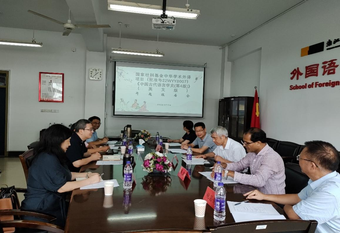 2023年7月4日下午,外国语学院召开我院2023年国家社科基金中华学术外译项目《中国古代语言学史(第4版)》开题报告会。浙江省外文学会常务副会长、浙江省翻译协会副会长、浙江大学博士生导师庞继贤教授,浙江科技学院硕士生导师税昌锡教授,浙江大学博士生导师、浙江省“西湖友谊奖”外籍专家英兰教授应邀担任评审专家,浙江科技学院科研处处长马伟锋出席并致辞,外国语学院相关项目组人员参加了此次会议。会议由外国语学院院长樊燕龙主持。