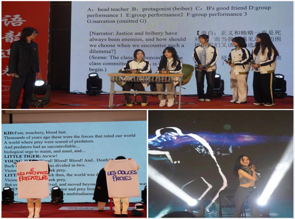 晚会在开场舞蹈Whistle中拉开了帷幕,小短剧Bribery and justice 寓理于剧,告诉我们要凭借实力去赢得他人的认可和尊重。《飞鸟集》的朗诵让大家感受到诗歌的魅力,飞鸟的翅膀,划破长空,留下温暖的希望和无尽的可能。《疯狂动物城》的舞台剧将剧情生动演绎,在充满奇幻和魅力的动物世界我们踏上了一场冒险之旅。 Lalaland舞蹈、River舞蹈展开了一场视觉盛宴,歌曲串烧带给我们别样的享受。《廉洁》的诗朗诵,让我们更深刻地理解廉洁这个永恒的主题。小品《敲诈》启示生活中我们需要提高警惕意识。歌曲《爱是一生的课题》让人感受爱意的浓厚,爱需要用心去探索、需要用情去体会、需要用行动表达,同学们纷纷在双语表演中大放异彩。