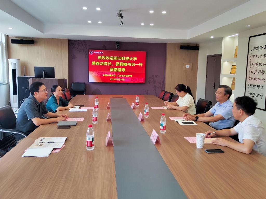 9月29日下午,我院樊燕龙院长、邵莉敏书记带队赴中国计量大学人文与外语学院开展调研交流。中国计量大学人文与外语学院院长邱高兴、副书记金民华等参加调研活动。
