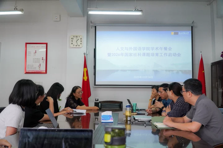 为营造潜心科研、追求卓越的学术氛围,全面推进2026年度国家社科基金项目申报工作,10月16日下午,学院在A3-306会议室成功举办学术午餐会暨国家社科基金课题申报启动会。会议由人文与外语学院副院长凌喆主持,特邀浙江财经大学外语学院原院长黎昌抱教授出席指导,学院执行院长樊燕龙与拟申报国家社科基金的教师共同参会。