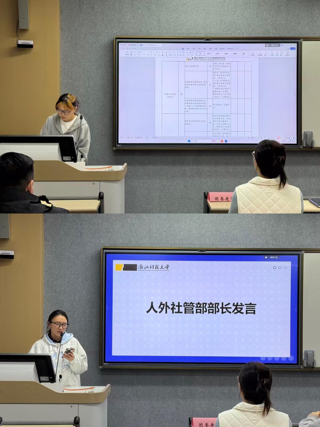 秋意渐浓,奋进当时。为进一步加强学生社团规范化建设,提升社团活动质量与影响力,2025年11月6日晚,我院社团管理部于教学楼A1-105组织召开本学期第一次社团负责人全体大会。出席本次会议的有我院团委老师张晴晴、我院社团管理部门全体成员及各社团负责人。本次会议旨在明确新学期社团工作规范,解读星级评定政策,推动社团活动有序、高效开展。