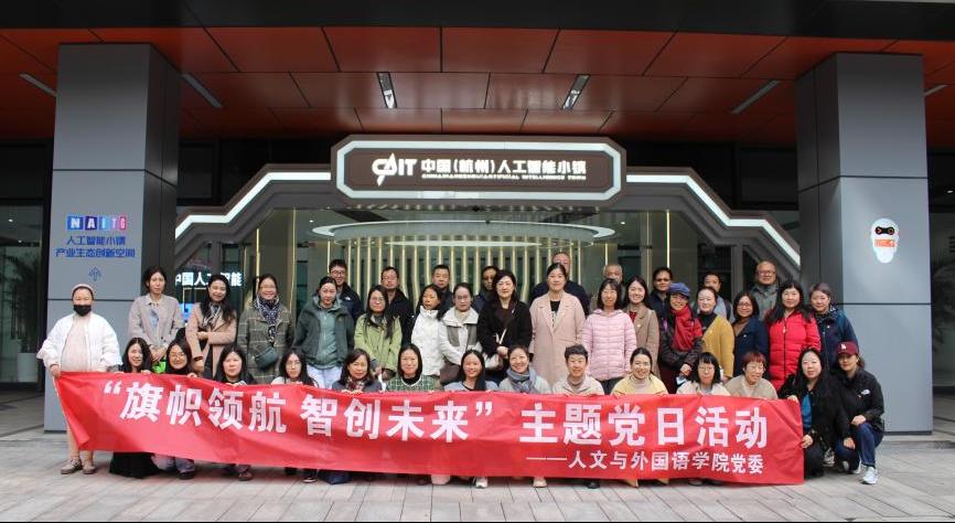 习近平总书记强调:要“推进人工智能全学段教育和全社会通识教育,源源不断培养高素质人才。”为深入贯彻习近平总书记的重要讲话精神,学习贯彻党的二十届四中全会精神,11月27日,人文与外语学院党委组织教师党员46人赴中国(杭州)人工智能科技小镇和海创园进行参观学习,开展主题党日活动暨理论学习中心组实践学习活动。